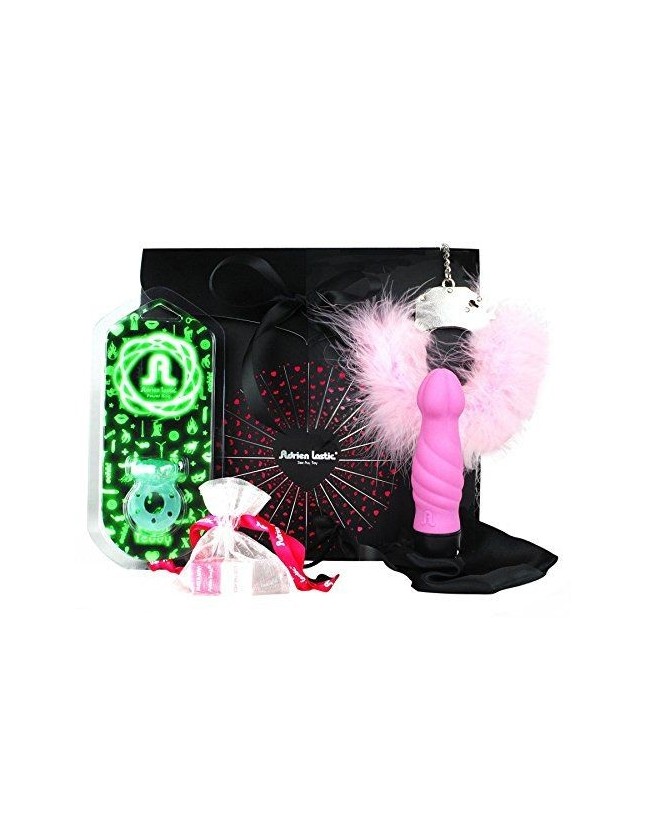 El kit esta compuesto por: Anillo vibrador fluorescente Juego de Dados, Donde tus fantasías más deseadas te esperan. Cada persona tira los dados y luego actúa según la combinación de los ellos. !Es muy fácil y nadie pierde! Esposas Ideales para jugar y hechar a volar tu imaginación, Las esposas Adrien Lastic, con plumas naturales, vienen en tres colores diferentes, incluyen un juego de llaves. Vibrador; Tornado se destaca su diseño exclusivo, muy orgánico, con marcados volúmenes, Tecla muy sensible al tacto para variar progresivamente la intensidad de vibración. Su motor es potente y resistente aunque silencioso, gracias a una electrónica especializada. Requieren 2 pilas tipo AAA, (no incluidas)