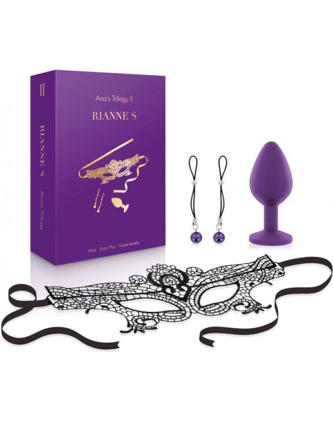 Conjunto de Ana Trilogy II en el rango de Rianne S. Un conjunto de 3 piezas , que consiste en plástico, pinzas en los pezones ajustable , una máscara veneciana y un conector trasero de silicona . Este juguete es de tamaño pequeño , así que es perfecto para los principiantes. Buen conjunto para el suplemento en sus momentos íntimos.