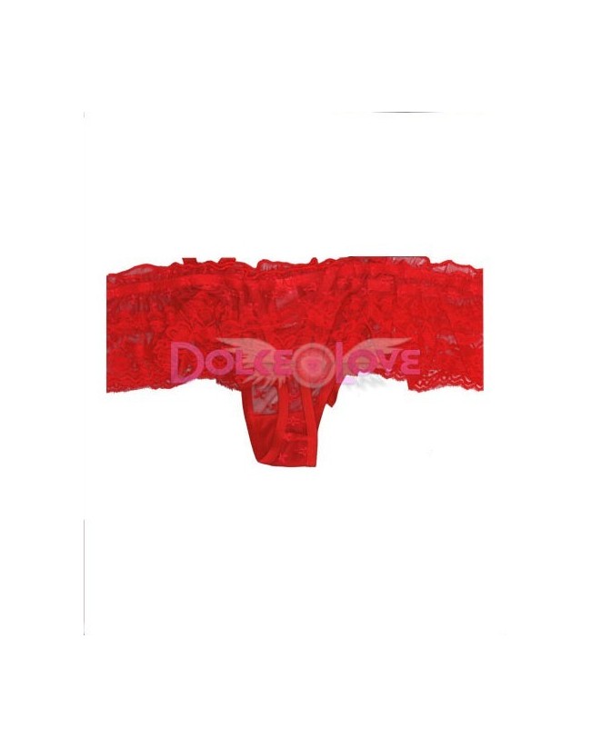 Braguita Tanga Roja de encaje floral combinado con transparencias. Además tiene dos grandes lazos rojos.