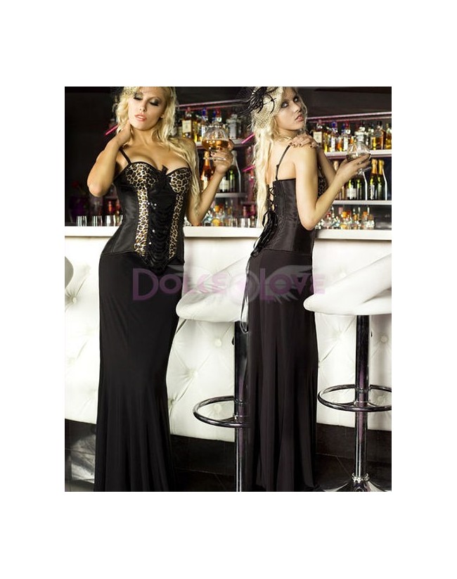 Elegante corsé de satén negro que cuenta con inserciones de leopardo en la zona delantera, así como un arco de gasa entre el pecho acompañado de hilos de lentejuela. Cierre en el lateral por dos filas de corchetes, cordón trasero ajustable que garantizan una silueta perfecta.