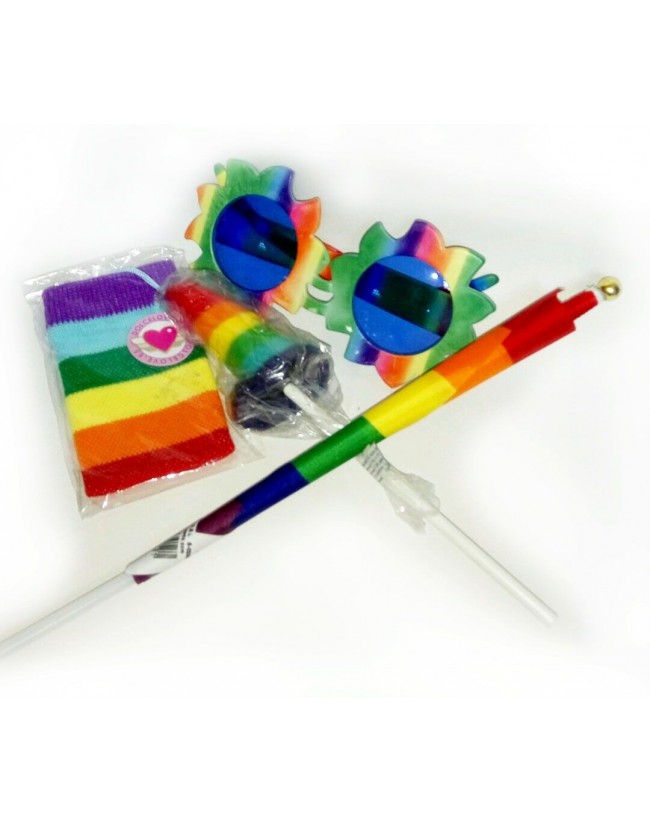 Lote compuesto por un rico caramelo para disfrutar y saborear, una bandera, unas gafas divertidas y una funda de punto para el movil.