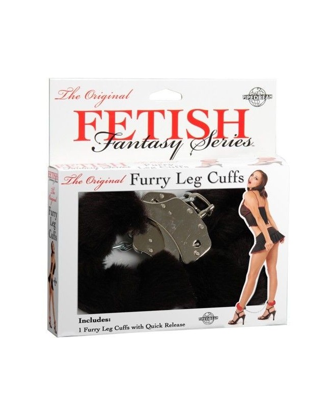 Fetish Fantasy Furry Leg Cuffs Black son unas esposas para tobillos de dos piezas unidas con una cadena de acero cromado, recubiertas con un suave peluche alrededor de los tobillos de color negro.