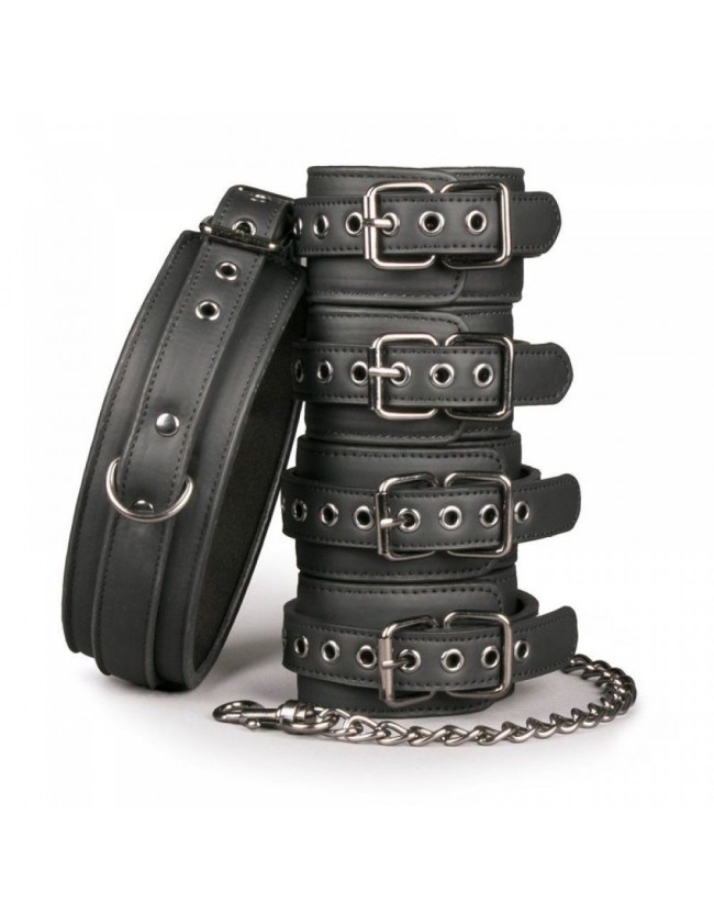 Compuesto por correa para cuello, cuatro grilletes y una cadena, para conectarse entre distintas posiciones entre si.