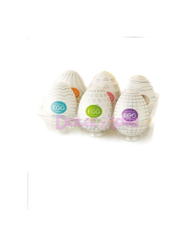 Huevera Modelo 1, es un surtido de 6 Eggs o huevos masturbadores de tenga: Wavy, Clicker, Spider, Twister, Stepper y Silky.