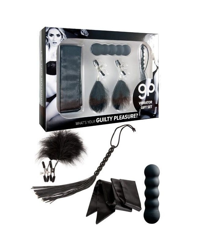 Set bondage compuesto por venda, pinzas con plumas, látigo y vibrador. Vibrador de Silicona de 10 modos de vibración.