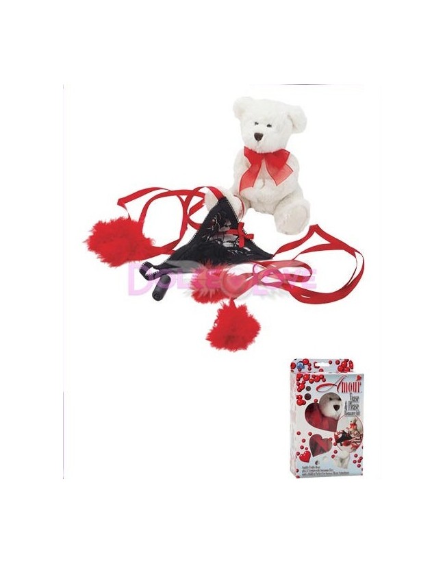 Este es un kit Romántico AMOUR, compuesto por un osito de peluche suave y dulce de color blanco, una micro bala vibradora (con pilas) y un tanga ajustable, que pertenecen a la colección AMOUR de California Exotics.