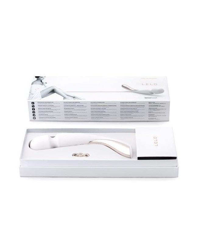 Smart Wand se presenta en la galardonada caja LELO con su cargador específico del país, una bolsita de satén para guardarlo, un broche INSIGNIA y la garantía completa de 1 año.