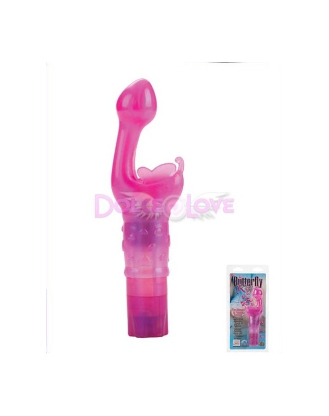 Butterfly Kiss de color rosa, te presentamos este maravilloso estimulador del Punto G y clítoris, fabricado en una suave gelatina de alta calidad, no es tóxico, es higiénico y está libre de phalatos.